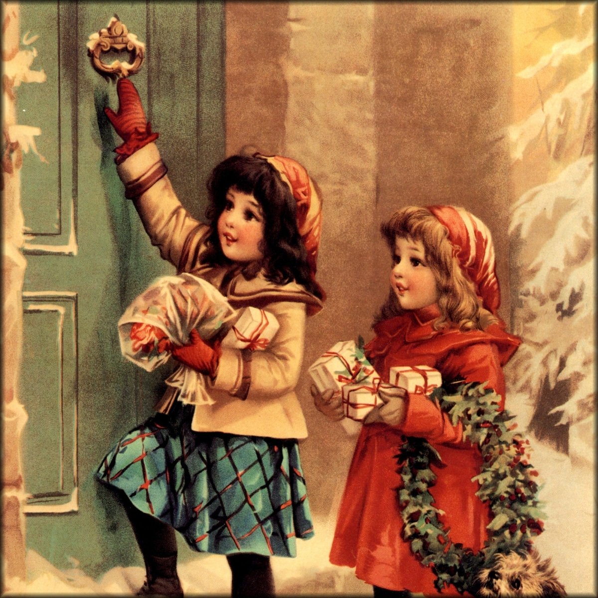 This delightful Christmas scene from 1909 was originally published by Raphael Tuck. It features two little girls and their dog making a Christmas morning call in the snow, carrying presents and a wreath.
