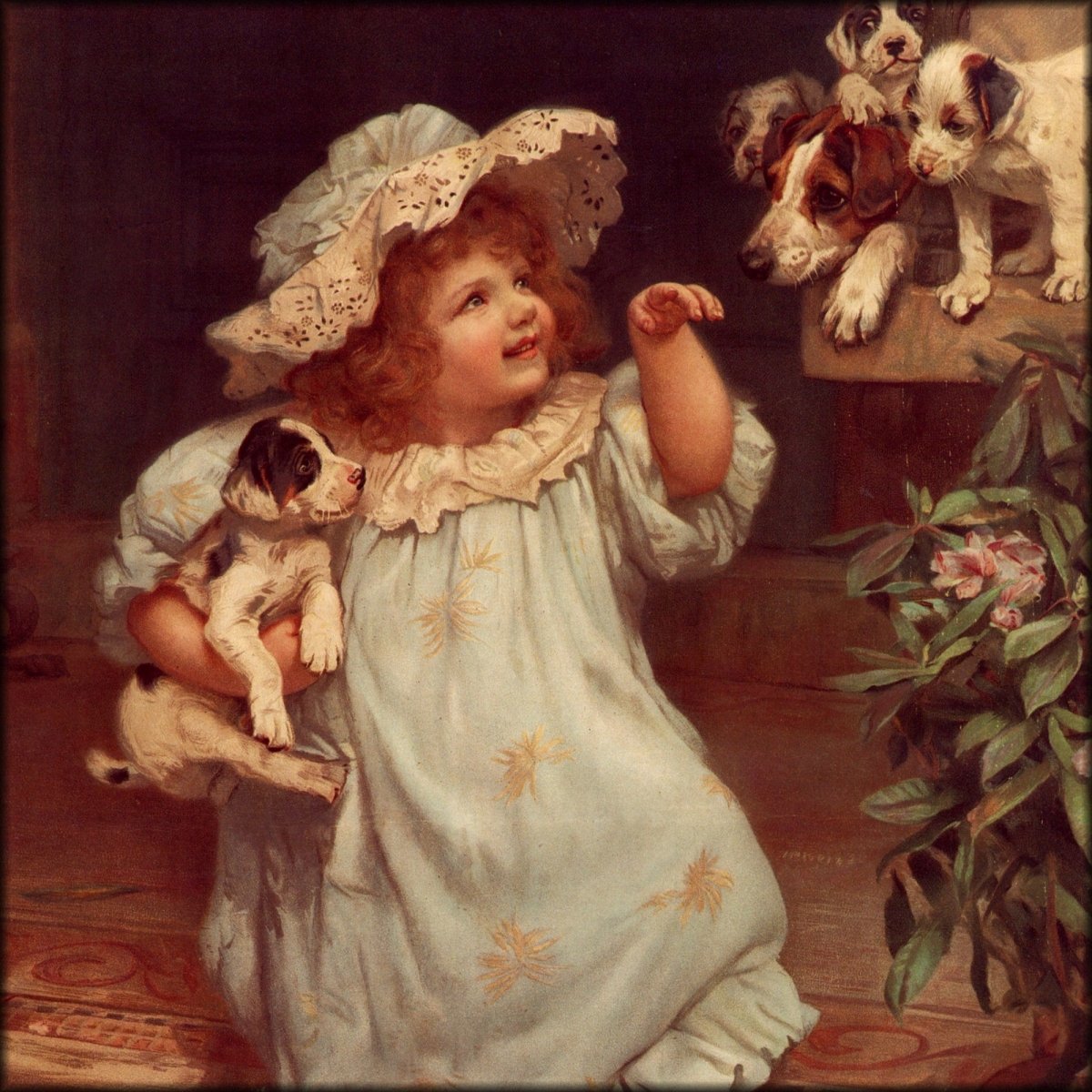 This delightful Victorian portrait from 1894 shows a child in a blue dress with a bonnet, surrounded by her cute puppies.