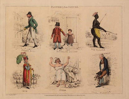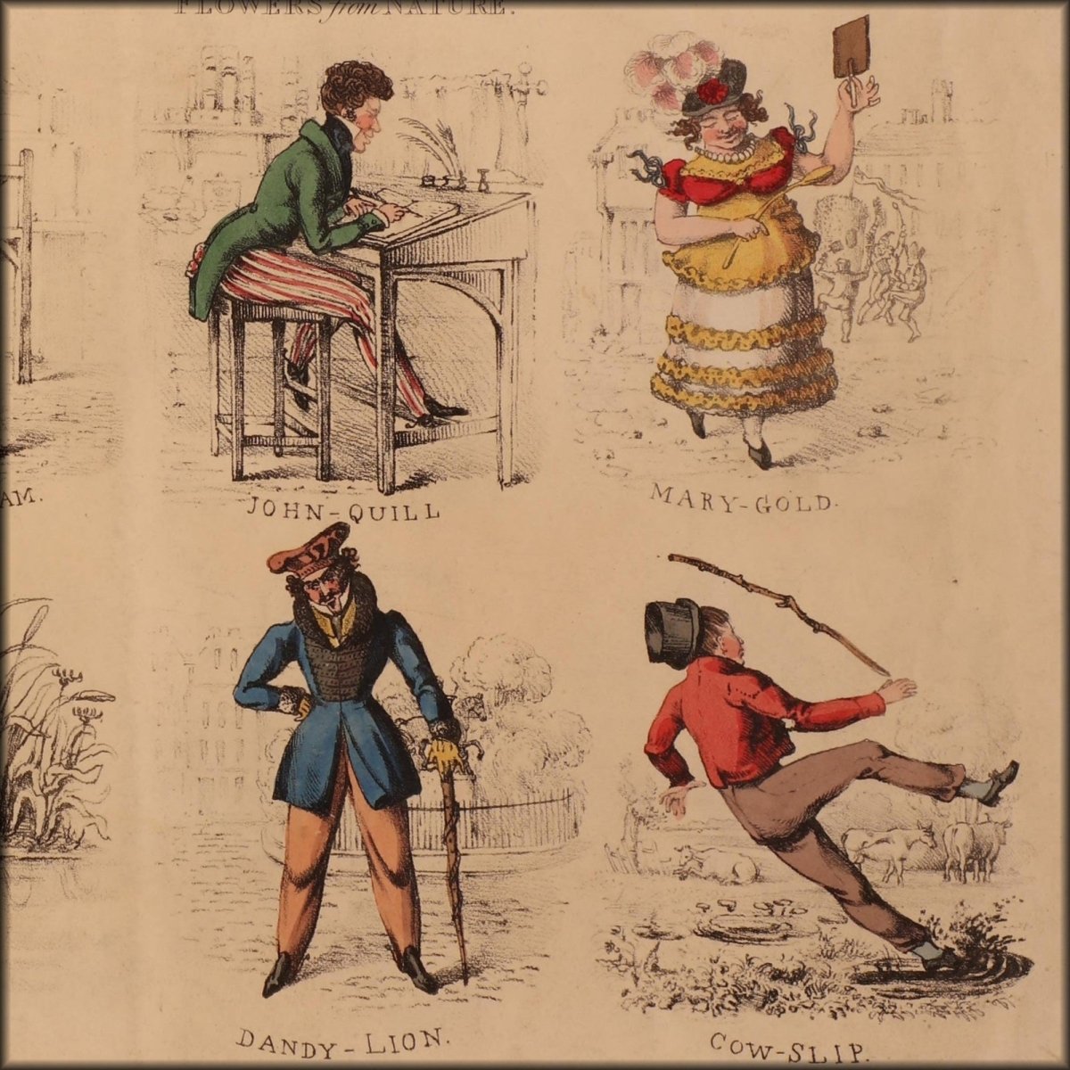 Each of these pages features 6 humorous takes on a flower name, such an 'An Enemy' (with a picture of the devil), Prim Rose (with a 'proper' lady) and 'Stocks' (with a picture of the humiliating kind of wooden village stocks).