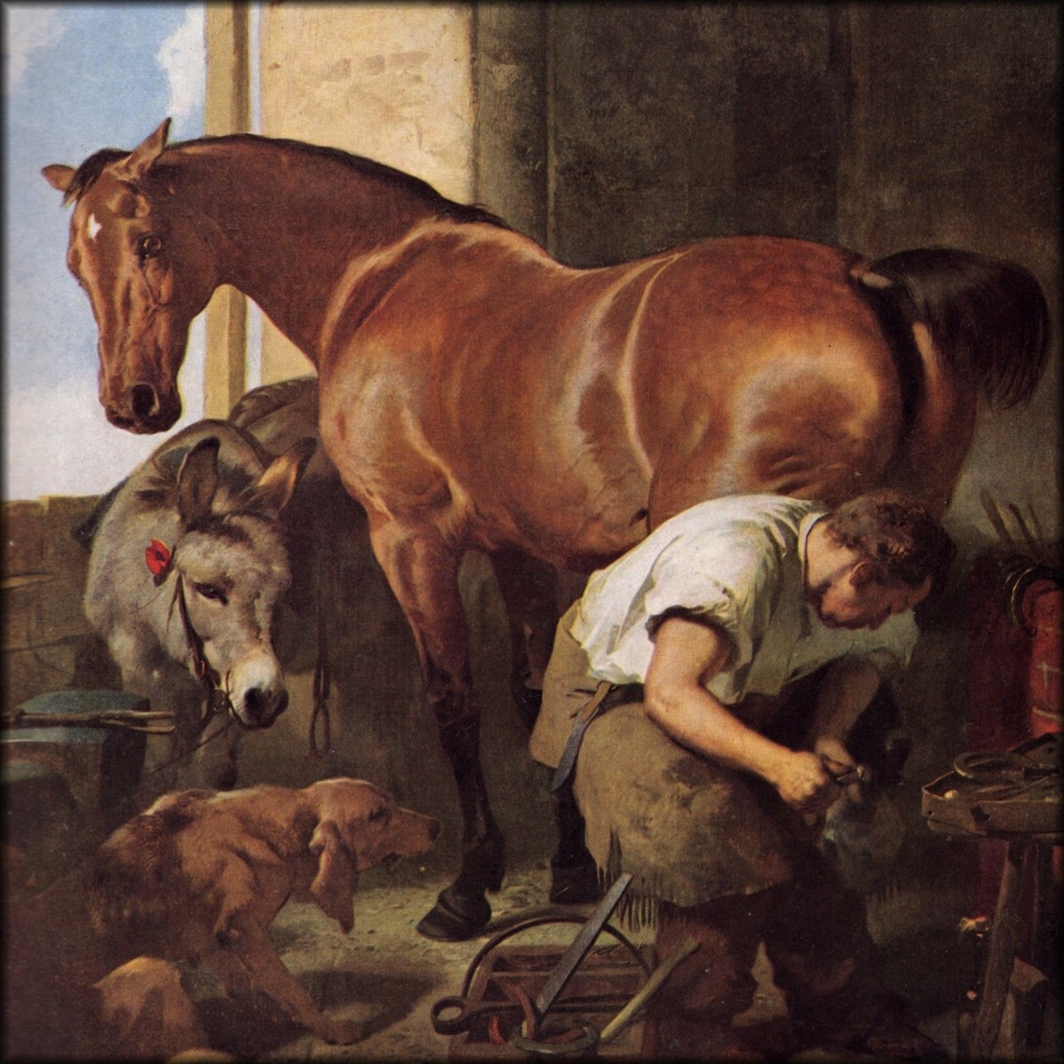 This picture by Landseer is of a horse being shod, overseen by a dog and a donkey.