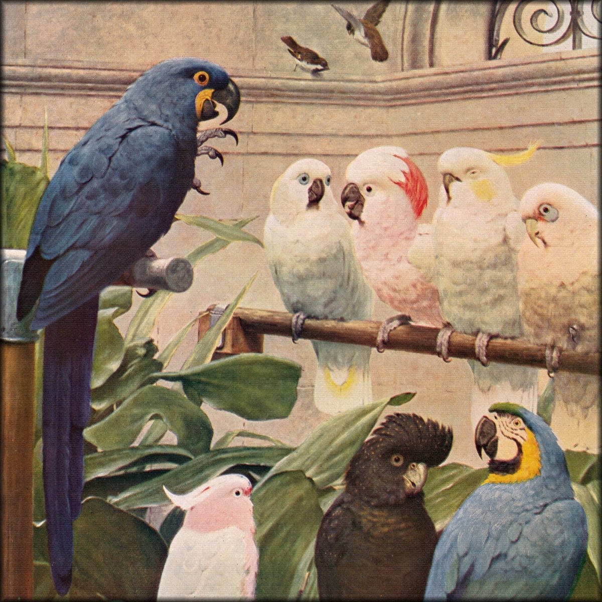 Artwork by British artist, Henry Stacy Marks featuring parrots and parakeets.
