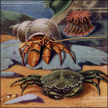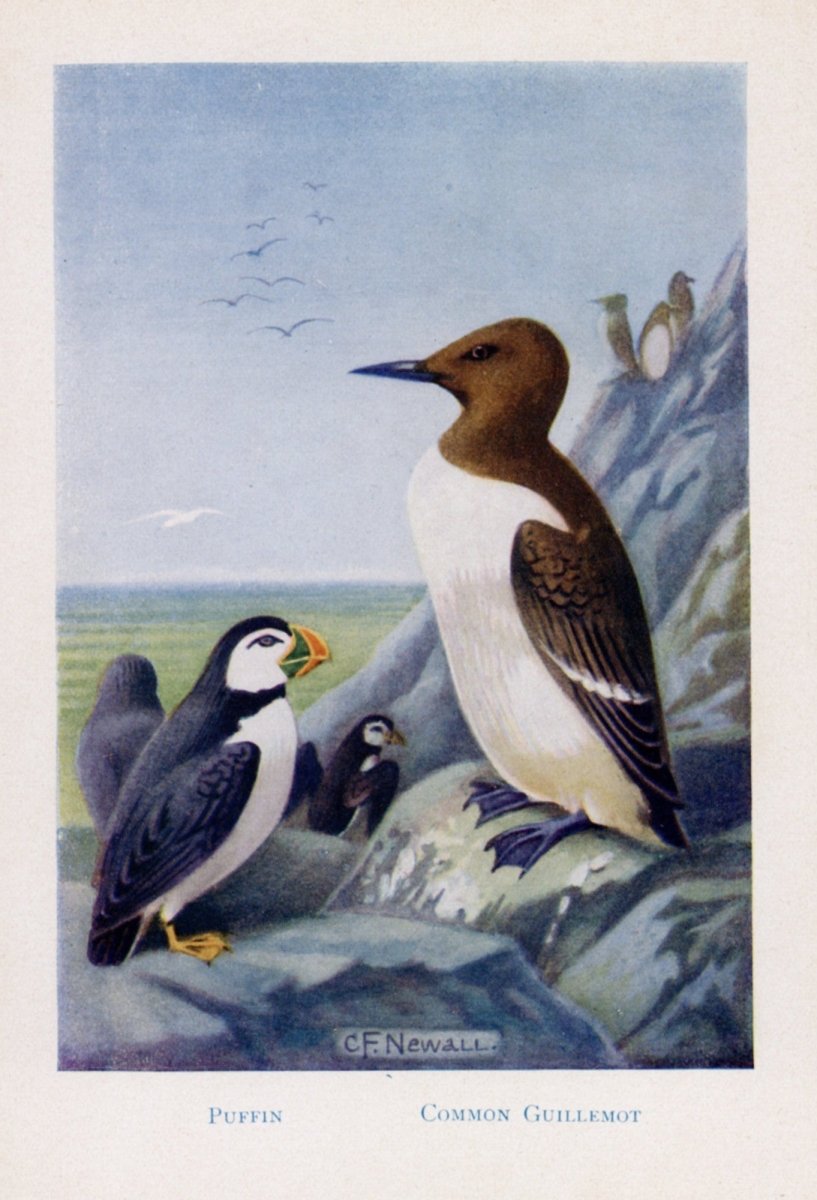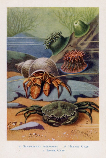 These are really lovely illustrations by Charles F. Newall featuring various items from the seashore including crabs, starfish, puffins, seagulls, a whelk, cockle, mussel, limpet and more.