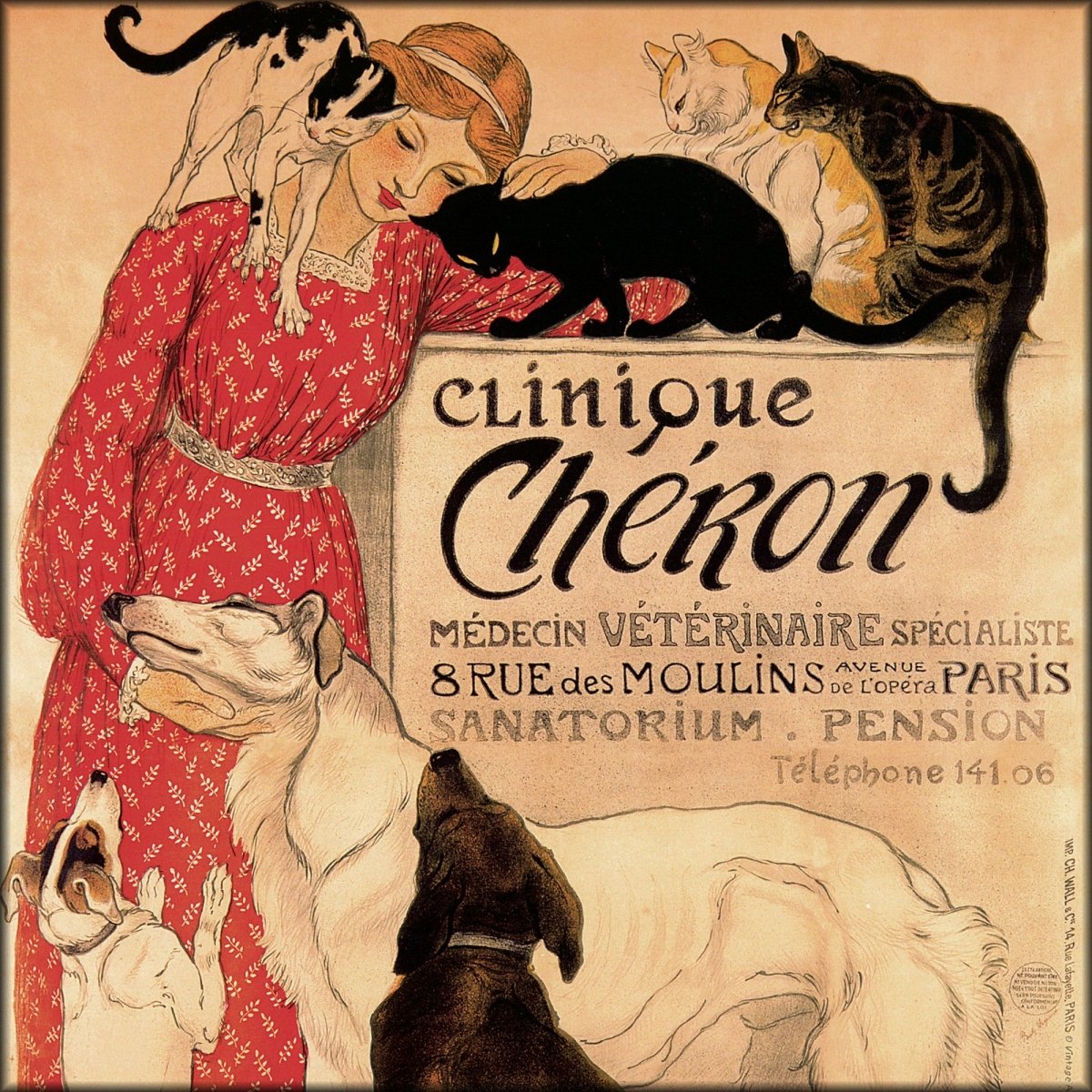 Clinique Cheron is a 1905 French advertising poster featuring cats and dogs by Swiss-born French artist Steinlen.